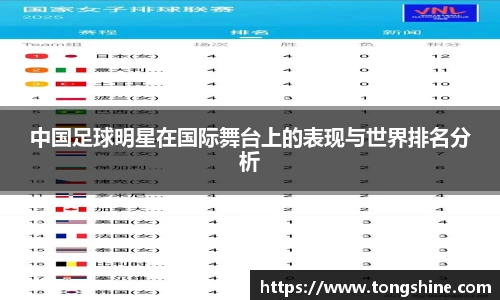 本文将深入分析中国足球明星在国际舞台上的表现及其世界排名,旨在全面了解这一领域的现状与发展趋势。文章首先从中国足球明星的历史成就入手,回顾几位杰出球员在国际比赛中的突出表现。接着,将重点讨论当前中国足球的整体水平,包括国内联赛的发展情况以及球员们在海外联赛中的表现。此外,将通过国际足联(FIFA)排...